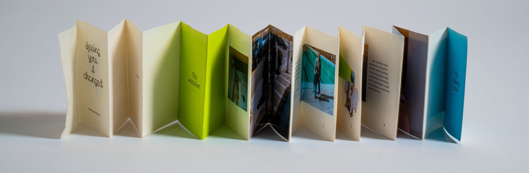 Seeing You, I Changed is a concertina-style book that reflects on the impact of sibling relationships on personal development, focusing on my own bond with my older sister.